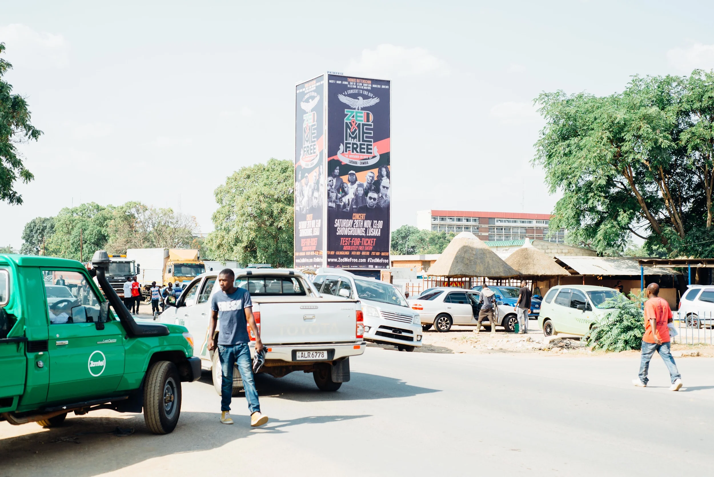 A vertical billboard deployed near the central bus station in Lusaka, the capital city of Zambia.
